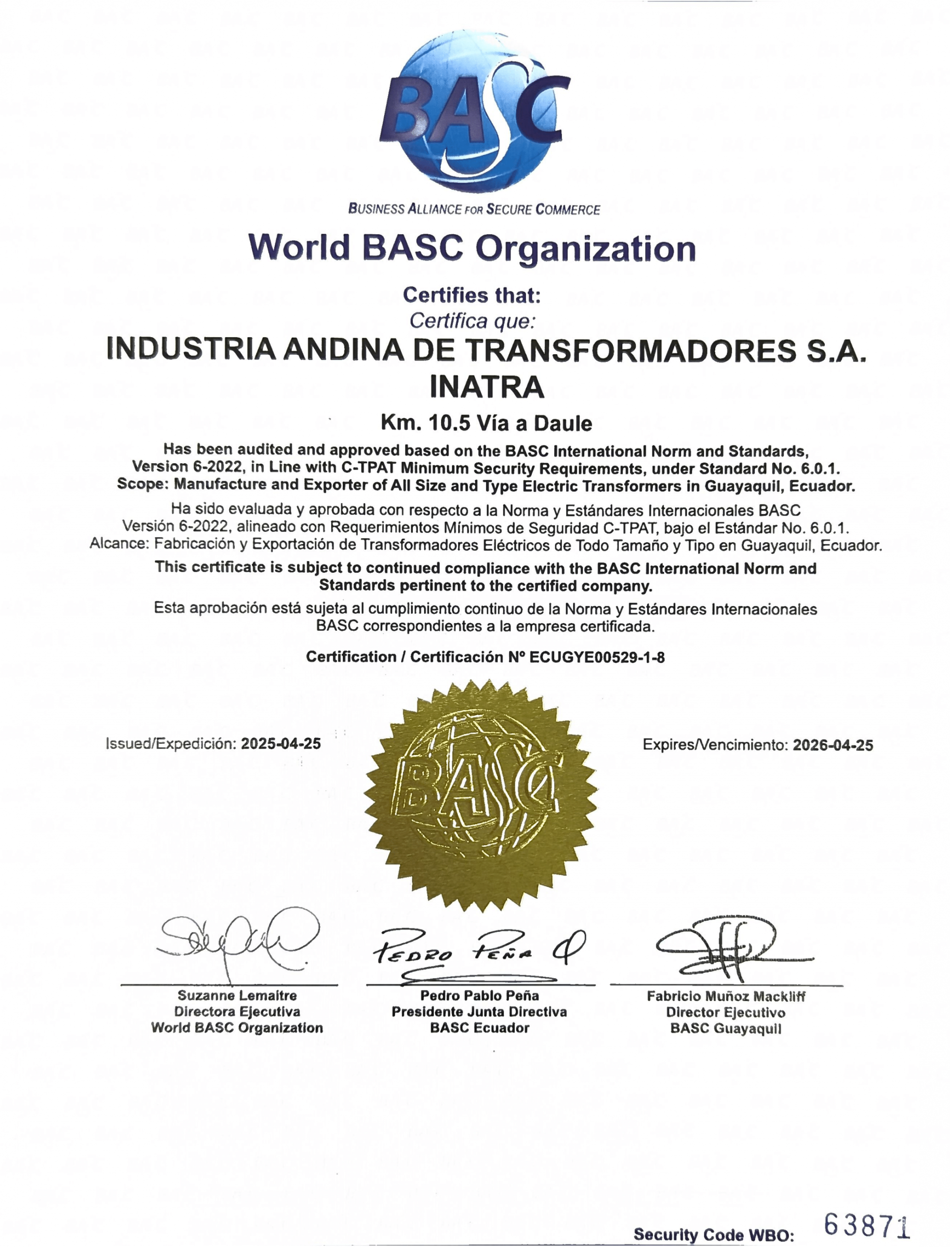 En Inatra, nos enorgullecemos de anunciar que hemos actualizado nuestra certificación BASC (Business Alliance for Secure Commerce). Esta certificación es un reconocimiento a nuestros esfuerzos continuos por mantener los más altos estándares de seguridad en la cadena de suministro y garantizar la calidad de nuestros productos y servicios.